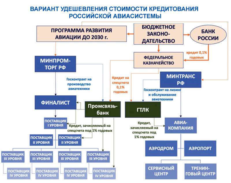 Суть идеи (рисунок 5.2) состоит в том, чтобы отлаженную систему спец-счетов, обслуживающих ГОЗ, использовать для длительного кредитования авиастроения. Для этого в рамках, предусмотренных Программой развития авиации до 2030 г. (или до 2035 г.), Минпромторг России и Минтранс России при участии соответственно Промсвязьбанка и ГТЛК заключают контракты с авиастроителями и авиакомпаниями. Банк России предоставляет Федеральному казначейству эмиссионный займ под 0,1% годовых. Федеральное казначейство на спецсчета под 0,1% годовых кредитует Промсвязьбанк и ГТЛК, которые, в свою очередь, под 1% годовых кредитуют долговременные авиастроительные и авиаэксплуатационные проекты, используя при этом спецсчета. Далее эти средства со стандартным для спецсчетов механизмом контроля ценообразования и целевого использования направляются авиастроителям и авиакомпаниям. Объем кредита должен составлять не менее 80% от сумм государственных контрактов. Операционные расходы и плановая прибыль Промсвязьбанка и ГТЛК должны укладываться в пределы 0,9% годовых от суммы предоставленного кредита.