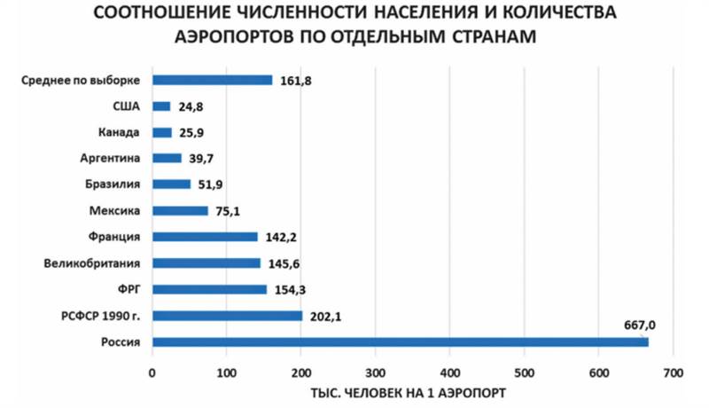 В России один аэропорт приходится в среднем на 667 тысяч человек, в то время как в советское время показатель был втрое лучше446 (рисунок 5.7). При сравненииуровняобеспеченностигражданскойавиацииназемнойинфраструк-турой в расчёте на 1 км2 показатели ещё хуже. Один российский аэропорт приходится на 77,9 тыс. км2, что всемеро хуже показателей советской авиационной системы. Как следствие, Россия отстаёт по развитости наземной инфраструктуры практически от всех стран со значительными размерами территории447.