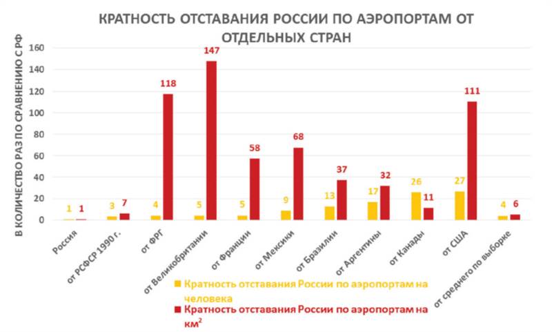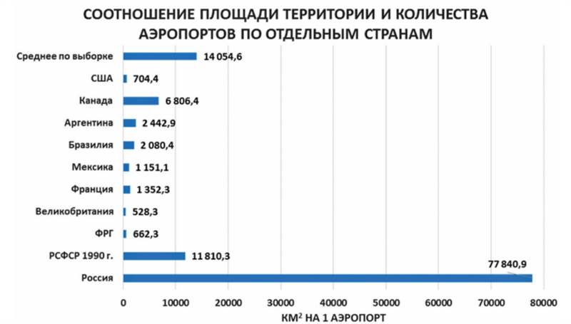 Деградация наземной инфраструктуры является одним из главных сдерживающих факторов развития внутренних авиационных перевозок. Авиационные перевозки стали выполняться минимальным количеством летательных аппаратов, с использованием минимального количества крупных хабов со свёртыванием иной авиационной активности. Исходя из официальных документов, в Государственный реестр аэродромов и вертодромов гражданской авиации включено 235 аэродромов, 92 из которых образуют национальную опорную аэродромную сеть. Территориальными органами Росавиации учтено 2430 посадочных площадок, из которых не более 630 оформило паспорта обеспечения транспортной безопасности, т.е. реально функционирует452.