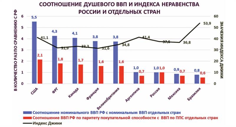 Если отставание от США, Канады, Франции, Великобритании и ФРГ ещё можно объяснить различием в уровне ВВП и ВВП на душу населения, то более чем десятикратное отставание от Мексики, Бразилии и Аргентины невозможно объяснить никакими объективными причинами450. Так, по уровню душевого ВВП и уровню душевого ВВП по паритету покупательной способности Россия превосходит Мексику, Бразилию и Аргентину, а по индексу неравенства имеет аналогичные или лучшие показатели451 (рисунок 5.8).