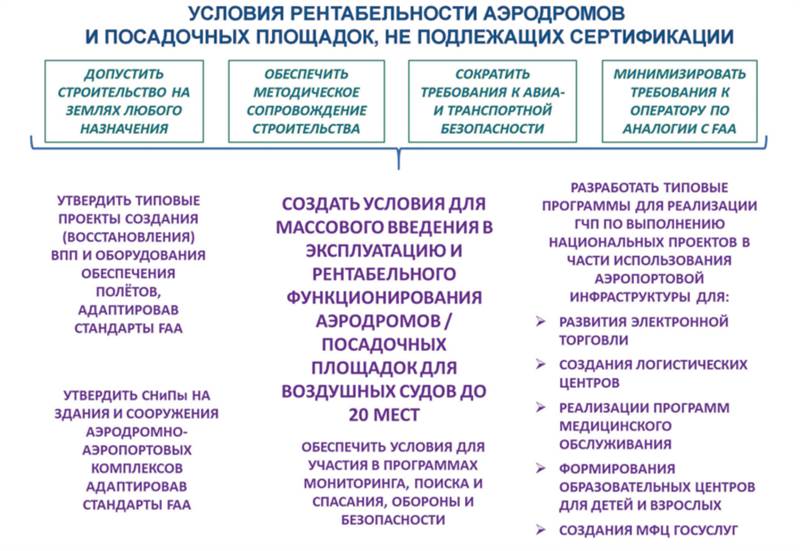 4. Наконец, четвертым шагом является оптимизация подходов к построению системы субсидирования несертифицируемых посадочных площадок. Например, в США государство (FAA) выделяет гранты на содержание и реновацию публичных посадочных площадок, при условии их открытости для проведения взлётов / посадок без ограничений.