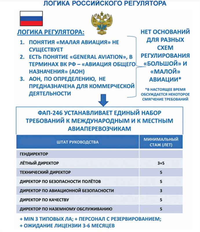 Национальные авиационные власти декларируют стремление дифференцировать требования к коммерческим воздушным перевозкам лёгкими и тяжёлыми воздушными судами, что нашло отражение в авиационных правилах к эксплуатантам коммерческих воздушных перевозок, вводимых в действие с сентября 2022 г.488 Документ выглядит довольно странным по форме, например, его полное название состоит из 50 слов.