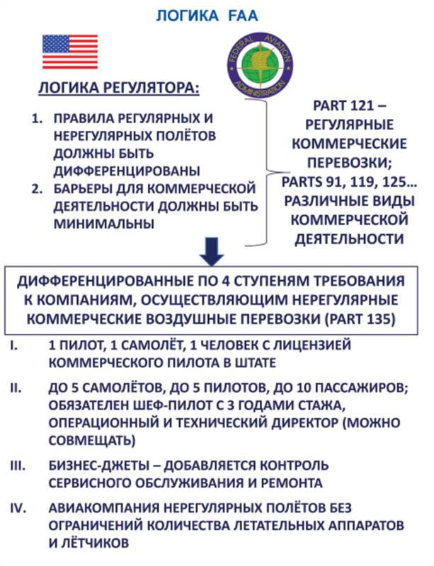Владелец сертификата 14 CFR 135 имеет широкий набор возможностей в зависимости от объёма операций, которые он планирует выполнять – от работы на единственном воздушном судне с единственным коммерческим пилотом, имя которого указывается в лицензии, до полноценной авиакомпании нерегулярных полётов491. Данная дифференциация обеспечила функционирование в США порядка 100 авиакомпаний с максимальной лицензией и порядка 2000 коммерческих перевозчиков с усечёнными лицензиями492. Примечательно, что в США всего 59 крупных авиаперевозчиков, сертифицированных по Part 121.