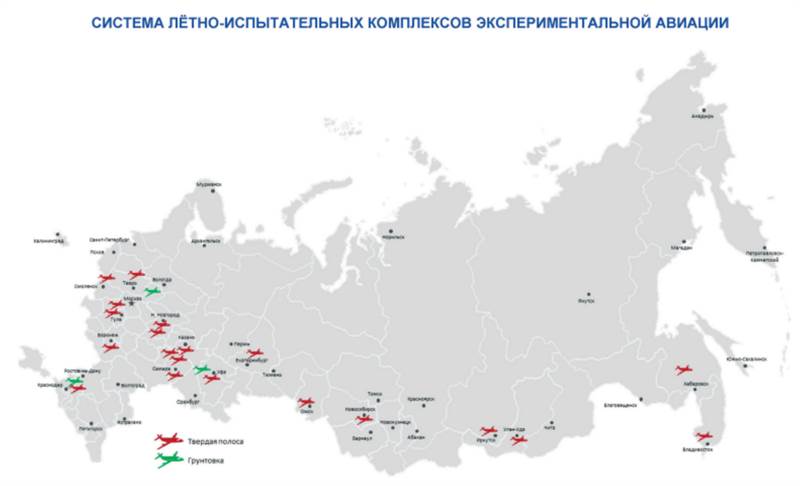 Однако во всём мире определены условия, при которых воздушные суда, наземная инфраструктура и персонал АОН могут переходить в состав коммерческой авиации и, как следствие, оказывать платные услуги. Проведение организационно-технического эксперимента под флагом экспериментальной авиации упрощается благодаря тому, что Россия обладает самой развитой в мире системой лётно-испытательных комплексов, треть из которых расположена за Уралом (рисунок 6.10).