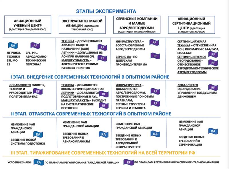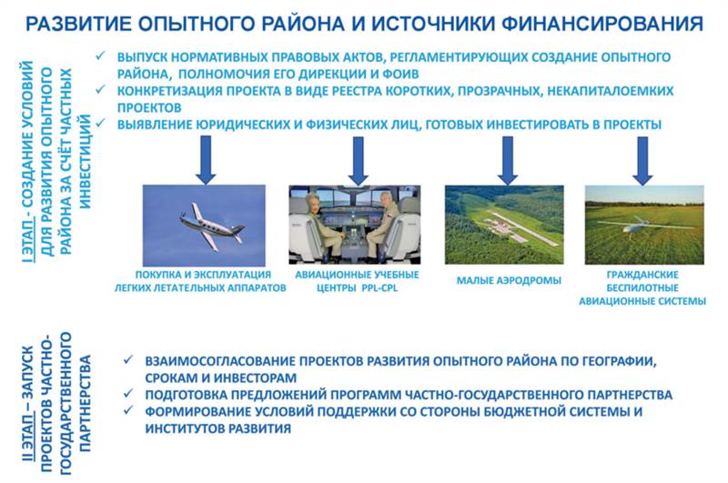 1.Внедрение в опытном районе современных технологий сертификации летательных аппаратов, наземной инфраструктуры и подготовки авиационного персонала. Приоритетом этапа станет создание условий для использования в коммерческой деятельности персонала и техники авиации общего назначения, а также не задействованных в коммерческой деятельности аэро/вертодромов и другой наземной инфраструктуры.