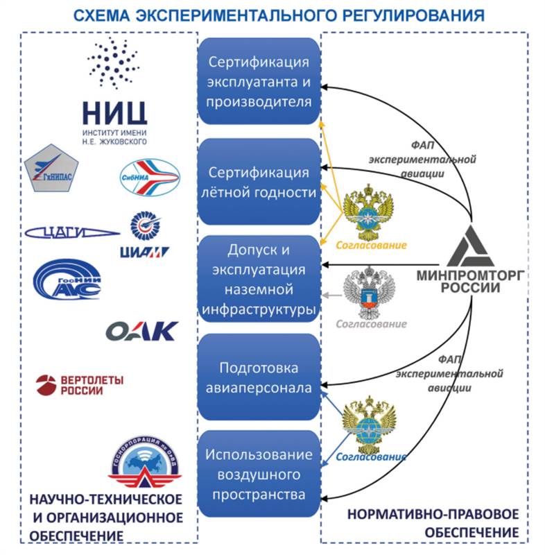 В сложившейся системе функционирования авиатранспортной и авиапромышленной отраслей имеется достаточно организаций, уровень компетентности сотрудников которых достаточен для решения задачи выстраивания новой системы регулирования, позволяющей активизировать использование лёгких пилотируемых и беспилотных воздушных судов (рисунок 6.12).