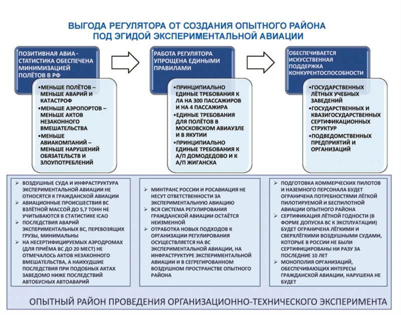 Экспериментальная авиация в международную статистику авиапроисшествий не попадает, тем более что эксперимент будет осуществляться с использованием лёгкой пилотируемой и беспилотной авиации, которая в принципе не учитывается в статистике авиапроисшествий ICAO. Существование экспериментальной авиации в качестве отдельного вида авиации, с точки зрения мировой практики, довольно экзотично, но данная экзотика при правильном её использовании может создать существенное конкурентное преимущество для развития российской авиационной системы.