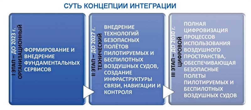 Концепция интеграции беспилотных воздушных судов в единое воздушное пространство Российской Федерации (рисунок 6.19) предусматривает очень длительные сроки583. Кроме того, Концепцией не предусматривается использование потенциала государственной и экспериментальной авиации, хотя, например, государственная авиация обладает несопоставимо большим опытом обеспечения одновременных полётов ПВС и БВС в едином воздушном пространстве, чем гражданская авиация.