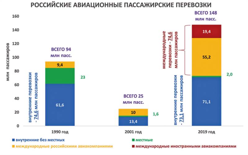 –пассажиропоток вне Московского авиаузла уменьшился с 28 млн человек 1990 году до 19 млн человек в 2019 году;
