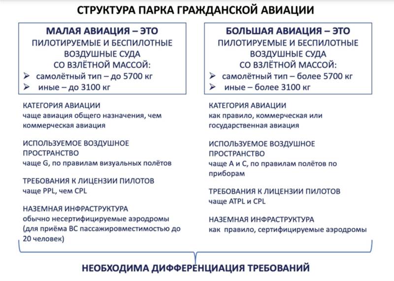 2.Из законодательства прямо следует необходимость разделения коммерческой авиации на «большую» и на «малую», включающую в себя «лёгкий» и «сверхлёгкий» сегменты. Для большой и малой коммерческой авиации должны устанавливаться дифференцированные требования к поддержанию лётной годности, функционированию системы управления безопасностью полёта, обеспечению авиационной безопасности, наземного обслуживания, порядку медицинского освидетельствования, предоставления аэронавигационной и метеорологической информации и др.;