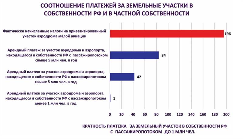 Таким образом, рост финансовой нагрузки только по платежам, связанным с использованием земельного участка, оказался почти в 200 раз больше, чем платежи за аналогичный участок аэродрома с пассажиропотоком до 1 млн человек (рисунок 2.3). Данные налоги по сути являются запретительными для большей части легальных авиационных перевозок и авиационных работ (за исключением авиационных перевозок с многомиллионным пассажиропотоком).