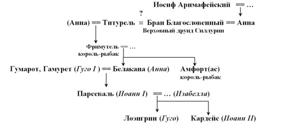 Рассмотрим вариант, иногда предлагаемый исследователями темы, отождествления Титуреля, как первого короля-рыбака, с Браном Благословенным. Согласно одному преданию и генеалогическому исследованию Лоренса Гарднера, Бран был верховным друидом Силурии (юго-восточной части Британии), был знаком с Иосифом Аримафейским и женат на его дочери Анне /25, с. 167/. Браном Благословенным в уэльской мифологии звали и британского короля, который ввел на острове христианство, после возвращения из Рима. По многим элементам легенд о нем можно принять, что он был и верховным друидом, сочетая в себе царскую и жреческую власть. Вполне возможно, что в обоих преданиях речь идет об одном Бране. Поскольку мало вероятно, что было два Брана, каждый из которых: со временем стал называться «Благословенным», был верховными друидом и сыграл важную роль в первой волне христианства в Британии. Небольшой поддержкой отождествления Титуреля с Браном является совпадение имен матери Иоанна I и жены Брана Благословенного (Анна). Деда Титуреля (по Альбрехту) звали Берилл (-ий), а деда Брана Благословенного – Белли. Отметим, что Роберт де Борон называет первого Короля-Рыбака именем Брон (Bron). 75 76