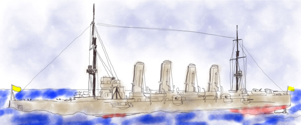 На крейсерах неприятеля стали видны четыре дымовые трубы, две мачты, а также шесть палубных орудий и четыре казематных.