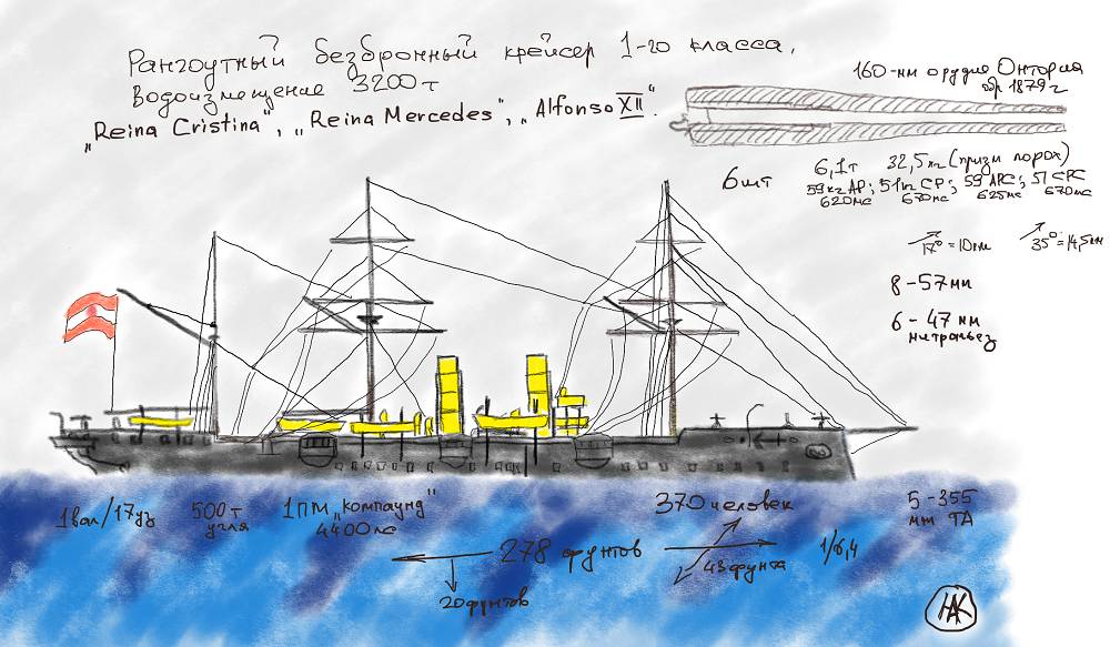 Крейсер «Принцесса Мерседес», один из трех однотипных безбронных крейсеров построенных к i886 году для Испанского флота. (Рисунок автора. СС0).
