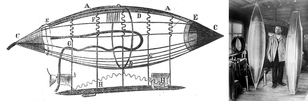 Изображение из работы «Возможен ли металлический аэростат» и Константин Циолковский с моделями своих стальных дирижаблей.