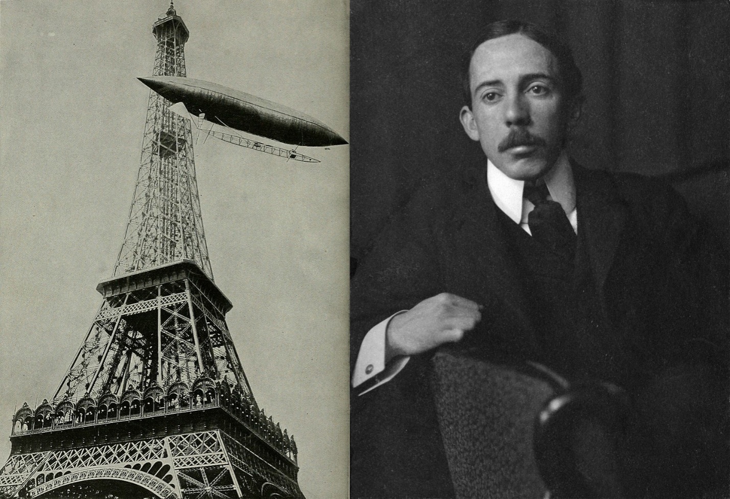 Альберто Сантос-Дюмон, портрет в полный рост, лицом вперед, сидит, положив правую руку на спинку стула и Дирижабль Сантос-Дюмон № 6, пролетающий вокруг Эйфелевой башни во время полёта, за который воздухоплаватель получил приз Дойча де ла Мерта62.