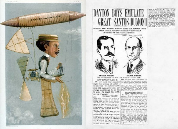 На карикатуре из журнала Vanity Fair (1901) и Газетный заголовок со страницы 8 от 18 декабря 1903 издания в The Dayton Daily News. Статья сравнивает полёты братьев Райт на аппаратах без «газовой сумки» с ранними дирижаблями Сантос-Дюмона.