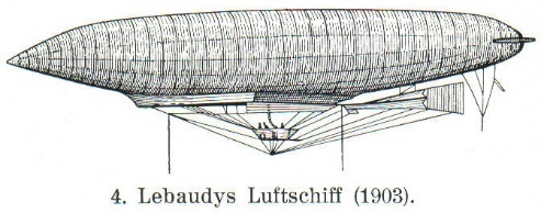 Но у него оболочка 56,5х9,8 метра, объемом 2284 м3, больше «Ла Франса» на 22 процента, была построена другой компанией – Astra (Звезда), бензиновый двигатель мощностью 40 л/с взят у Mercedes, а два воздушных винта диаметром по три метра, вероятно изготовлены самими французами. Объём баллонета составлял 300 м³. Дирижабль Lebaudy – первый успешный, на то время современный дирижабль. Дальность полёта составляла примерно сто километров, которые аппарат мог пролететь за три часа, зависело от направления ветра. После установки новой оболочки совершил дюжину полётов, но 28 августа 1892/1904 года был отнесен штормом и при этом сильно повреждён. После данного инцидента расчётливыми владельцамидирижабль отремонтирован и перестроен, баллонет увеличен до 500 м³ а сам Lebaudy до 2660 м3, или практически до одной пятой объема, вероятно предыдущего баллонетане хватило для регулировки высоты полета воздушного судна. Первый дирижабль вновь летал, но опять повреждён штормом при заход на посадку в Камп-де-Шалон. Вновь отремонтирован с опять увеличением объема до 2950 м3, а также установлен более мощный двигатель в 50 л/с, и 10 ноября 1893/1905 года достиг рекордной высоты 1370 метров. В декабре 1893/1905 года состоялась сделка о приобретении армией Франции за 80000 франков ($16,000) трехлетнего, побывавшего в двух авариях дирижабля. Для эксплуатацией новым собственником перестроен, объём баллонета вновь увеличен до 650 м³. Установлен французский двигатель Panhard-Levassor мощностью в 70 л/с вращавший два винта. Максимальная высота полёта в 1896/1908 году составила 1550 метров. Осенью 1897/1909 года простоял 17 дней пришвартованным под открытым небом через три года разобран, так как обшивка вероятно за пять лет изрядно обветшала.