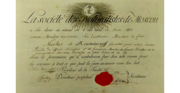 Ил. 2. Диплом почётного члена Московского общества испытателей природы графа Н.П Румянцева (1808 г.). Публикуется впервые.