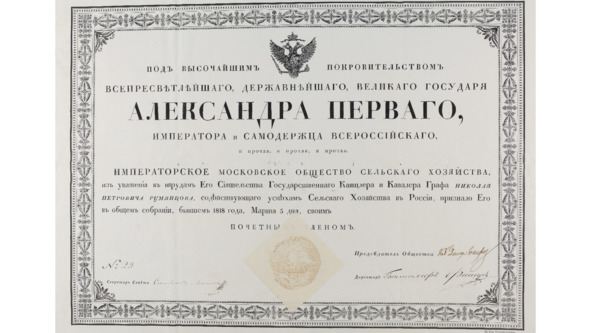 Ил. 3. Диплом почётного члена Императорского Московского общества сельского хозяйства графа Н. П. Румянцева (1818 г.).