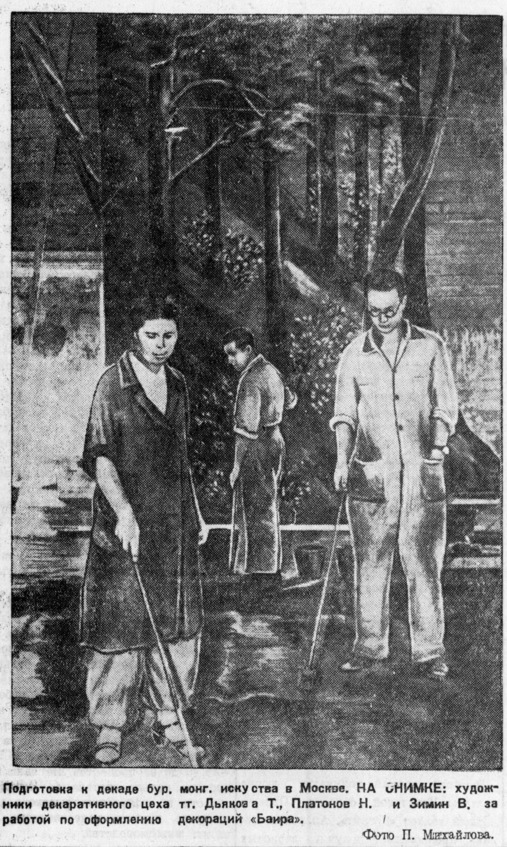 В марте по-настоящему заработали вспомогательные мастерские театра. В цехах головных уборов, чеканном, сапожном, отделочном, красильном ещё не доставало рабочих. Только для одной постановки спектакля «Баир» мастерские должны изготовить 525 костюмов, а для танца Цам 40 костюмов. Каждому артисту костюм шьётся отдельно с двумя примерками. В общей сложности для декады будет сшито 2500 костюмов. Сделанные художниками Черновым и Павловым эскизы костюмов поступают в цех закройки, потом в пошивочный, отделочный и т. д. Каждый цех придаёт костюму что-то новое, своё. Под руководством лучшего чеканщика Чегдурова (Джида, Желтуринский сельсовет) чеканщики приступили к изготовлению кольчужных украшений, национальных пуговиц, брони для воинов. Всего в мастерских работает 120 человек136. Для спектаклей будет написано 3 тысячи квадратных метров декораций. На скульптурные и бутафорские работы будут израсходованы несколько десятков тонн глины. Эскизы костюмов и бутафории выполняют художники Павлов, Тимин и Черноутов137. Скульптор Юркевич. Тащилов – начальник костюмерного цеха138.