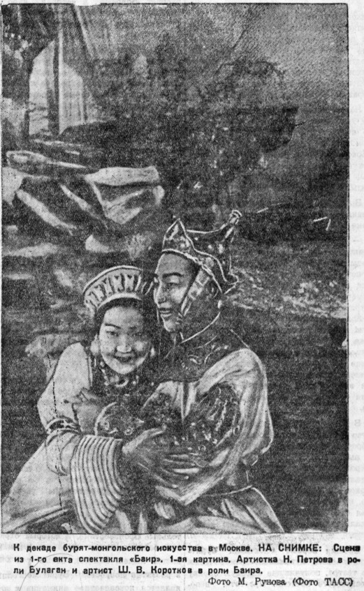 Работа над музыкальной драмой Шадаева и Цыденжапова «Баир» приближается к концу. В пьесе будет занято 350 артистов. Сценические репетиции почти закончены, утверждены эскизы костюмов и декораций120. Авторы либретто Шадаев и Цыденжапов многое изменили в либретто, в сравнении с первым вариантом пьесы. Содержание спектакля теперь приблизительно таково: