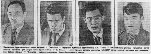 Указом Президиума Верховного Совета РСФСР звание Заслуженный деятель искусств РСФСР присвоено: Балдано Намжилу Гармаевичу, Сампилову Цыренжапу Сампиловичу. Звание Заслуженный артист РСФСР присвоено: Гармаевой Норме Трофимовне, Гендуновой Найдан Дашинамжиловне, Генинову Чойжиниму Гениновичу, Ильину Антропу Степановичу, Тарову Николаю Васильевичу.