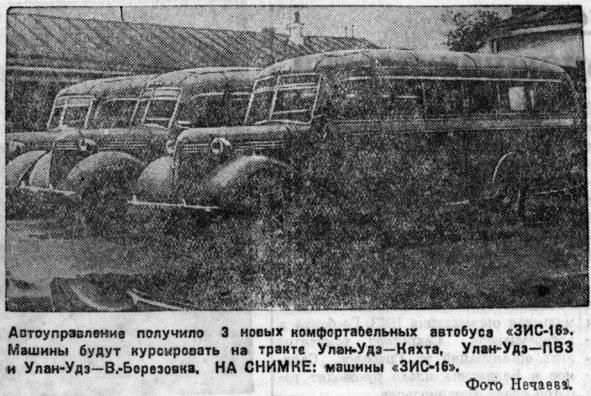 19 июля. Автоуправление получило 3 новых комфортабельных автобуса ЗИС-16. Машины будут курсировать на трассе Улан-Удэ – Кяхта, Улан-Удэ – ПВЗ и Улан-Удэ – Верхняя Берёзовка146. В гараже автоуправления работает 16 автобусов147.
