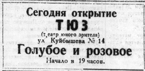14 мая начал работать ТЮЗ. Адрес театра ул. Куйбышева 14. Первый спектакль – «Голубое и розовое»440. К середине августа ТЮЗ посетили около 6 тысяч зрителей441. В 2013 году на здании ул. Куйбышева 14 висела вывеска «Союз театральных деятелей».