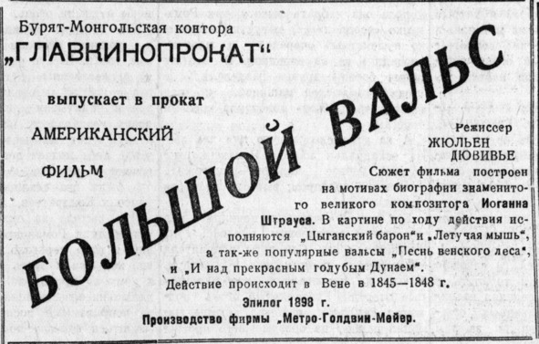 С 10 августа – американский фильм «Большой вальс» по мотивам биографии композитора Иоганна Штрауса. В сквере играет джаз-оркестр509. Фильм 1938 года. Шёл более двух недель.