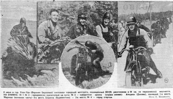 6 июня состоялся общегородской мотокросс, посвящённый ВСВХ (с 1959 года – ВДНХ), на дистанцию 53 км. Старт и финиш у Дома правительства в Верхней Берёзовке. В кроссе примут участие 15—20 мотоциклистов. Среди них Альцман от «Динамо» и Бобыкин от «Медика»591. Первое место занял Альцман, второе место – Жеряков (воинская часть) и третье место – Биданов («Буревестник»)592.