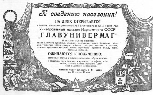 21 апреля в помещении бывшего универмага №2 Бурмонторга (ул. Ленина 24) открылся Универсальный магазин Наркомторга СССР «Главунивермаг»808. За первые 4 часа работы было обслужено 800 посетителей. Продано товаров на 62 тысячи рублей809.