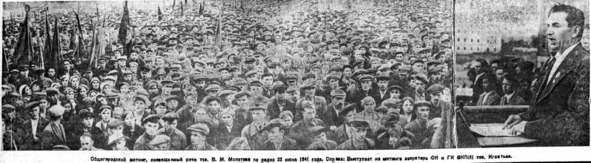 22 июня (в воскресенье) на предприятиях города прошли митинги. На митингах зачитывалась речь заместителя председателя Совета Народных Комиссаров Союза ССР и Народного Комиссара иностранных дел тов. Молотова, произнесённая им по радио. В железнодорожном саду митинг состоялся вечером855. Общегородской митинг был на площади Советов. На митинге присутствовало 65 тысяч человек856.