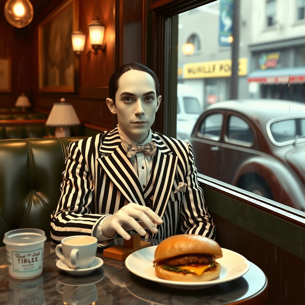 Мим кивнул, и они двинулись прочь от канала. Недалеко обнаружилось кафе сети быстрого питания "Капрос". Карлик уже озяб, сырой ветер задувал под плащ, а мим казалось, совсем не замёрз, хоть и был одет только в брючный, полосатый костюм. С удовольствием войдя в тёплое помещение кафе, карлик снял шляпу и кинул её на пустой столик у окна. Мим всё ещё немного в ступоре огляделся: кафе было почти пустым. Он снял с себя невидимую верхнюю одежду и повесил на спинку стула. Это движение не укрылось от глаз карлика, но он никак не отреагировал. Они уселись за стол, детектив достал блокнот и карандаш.