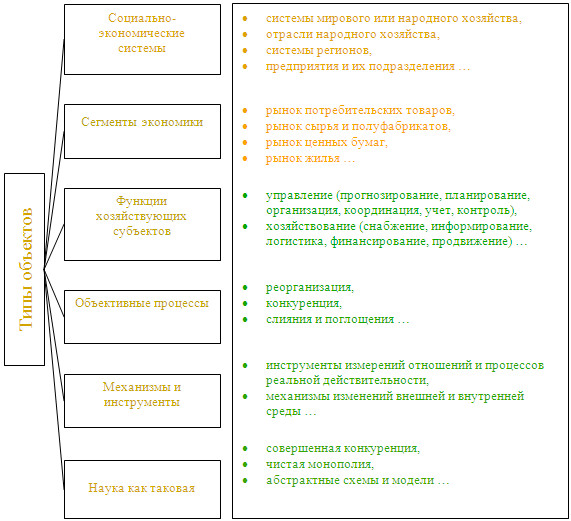 То есть объект – это та часть окружающих нас явлений, которой занимается исследователь. Так, исследования в области экономических наук проводятся в отношении явлений, объектами в которых выступают социально-экономические системы любого уровня: мирового или народного хозяйства, отраслей народного хозяйства, регионов, предприятий, подразделений или домохозяйств, а также иные типы объектов, представленные на рисунке 1.3.