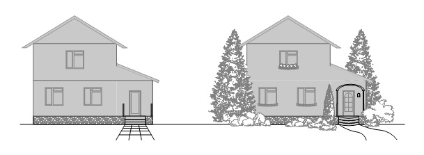 В случае, если элементов из «другой» группы слишком много, их необходимо постараться убрать или спрятать. Как же быть, если мы выбрали круг, а строения на участке прямоугольные? Во-первых, необходимо сделать строения менее заметными. Этого можно добиться за счет цвета (перекрасив строение или изменив отделочный материал). Бледные, сливающиеся с окружением, одинаковые отделочные материалы помогут уменьшить эмфазу строений. Во-вторых, необходимо дополнить строения «неквадратными» элементами, постараться убрать прямые углы (рис. 2.10).