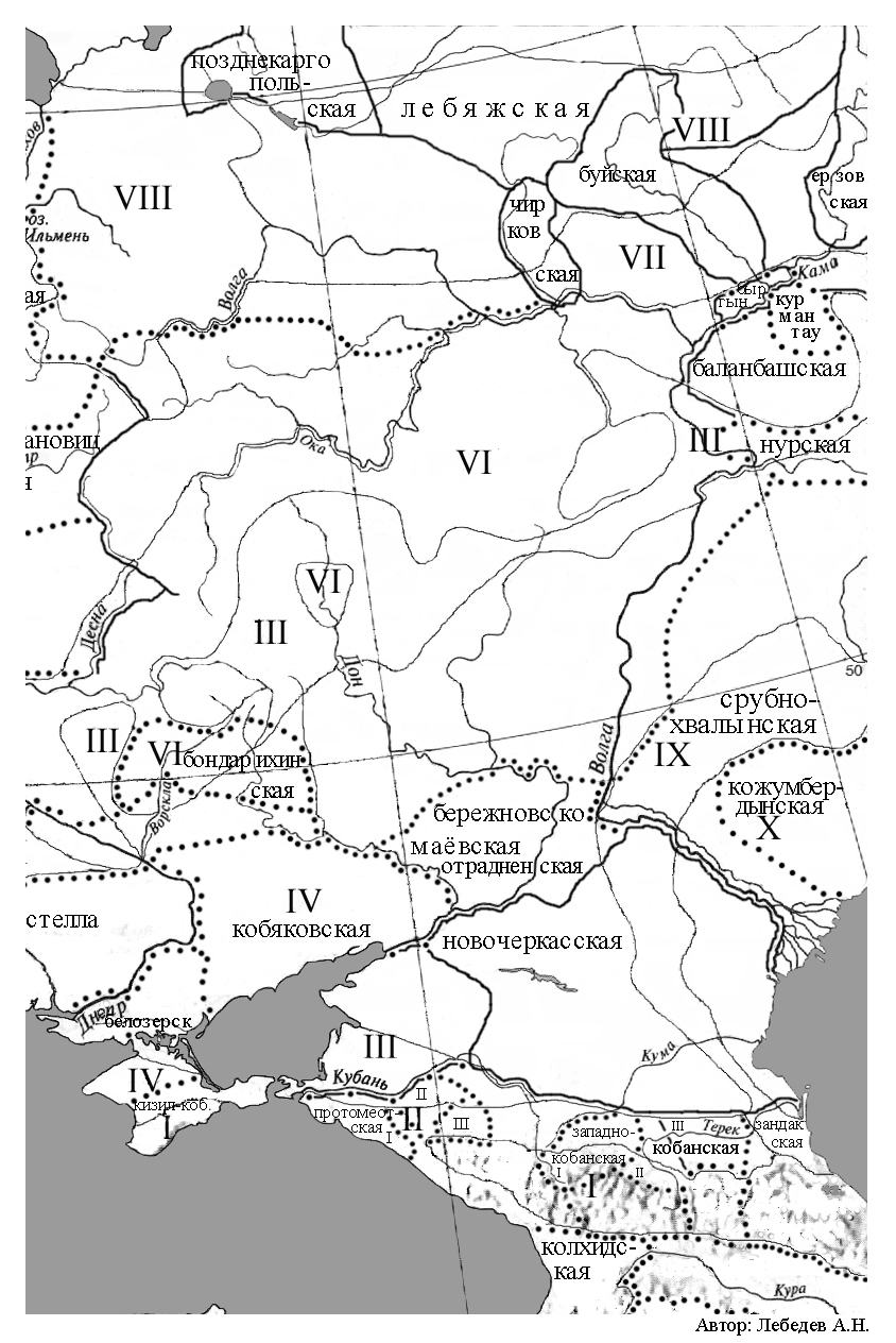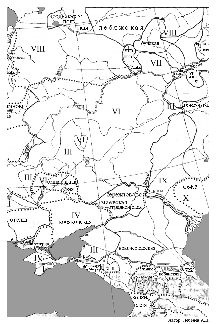 Восточное Приазовье. Территория в границах: левый берег нижнего Дона, левобережье Сала, Маныч, правобережье Кубани была занята, археологическими памятниками, которые пока никак не идетнифицированы. Нами эта территория обозначена как Меотида I. Население этой территории по источникам античных авторов известно как: дардарии, фатеи, тореты, тарпеты, меоты118. Хотя названия эти зафиксированы в более поздних источниках и других материалов под рукой нет, то нет и уверенности в том, что эти названия могут относиться и к этому периоду. Несмотря на это такими названиями можно воспользоваться, но с определенной долей осторожности. В данный, рассматриваемый нами отрезок времени, на территории Меотиды проживало две группы населения, которые своих покойников хоронили вытянуто на спине головой на юг119 и головой на юго-восток120.