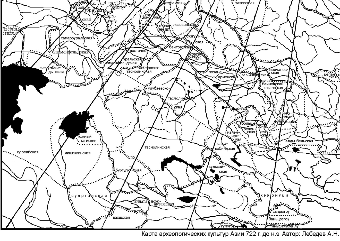 Рис.6. Карта археологических культур Приуралья, Казахстана и Восточного Туркестана 722 г. до н.э.