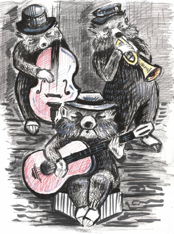 Между тем трое вомбатов устраивались на сцене. Первый вынул из принесённого ящика барабаны, второй – контрабас, а третий – гитару, фетровую шляпу и тёмные очки. Таков был его сценический образ. Прокашлявшись, мохнатый великан обратился к публике низким и хрипловатым голосом: