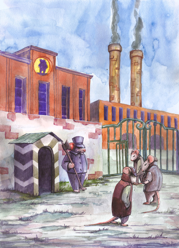 Площадь упиралась в забор с широкими воротами, что караулил часовой с алебардой. Забор огораживал фабричные корпуса – коричневые и серые коробки без окон и четыре исполинские трубы. На почтительном расстоянии от часового в очереди стояли мыши, одетые кое-как. Они переступали с ноги на ногу и мяли в лапах шапки.