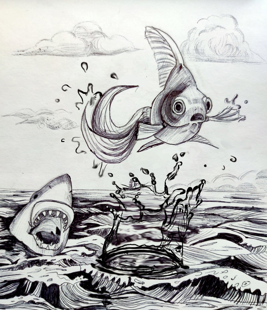 Акула погналась за рыбкой, и теперь погибель той казалось уже предрешённой. Плывя как можно быстрее, рыбка собрала последние силы и подумала: «Будь что будет!» С этой мыслью она выпрыгнула из воды и отчаянно замахала плавниками. Удивительно, но её плавники будто выросли и превратились в крылья, удерживающие тело в воздухе. От изумления акула приостановилась и даже забыла захлопнуть свою зубастую пасть. Тогда как рыбка всё летела и летела!