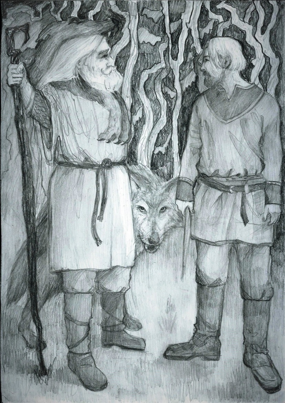 Страх одолевает человека, однако натягивает лук и целится в добычу. Но тут вдруг всё вокруг стремительно закружило-запуржило, затем вдруг стихло. В центре поляны заколыхалось свечение, и из него выступил высокий старик грозного вида. Седые у него волосы, седые брови, седые усы и борода. Зипун старика подпоясан простой верёвкой. Говорит он мягко, но твёрдо: