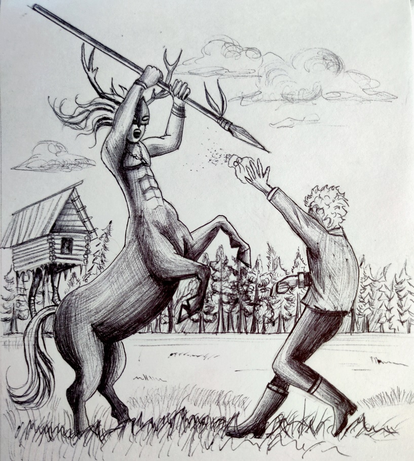 Раздался в чаще страшный треск, и выскочил из неё ужасный Полкан – до пояса человек, а ниже – тело коня. Бьёт он копытом, рукой потрясает с копьём! Поскакал невиданное чудище на человека, угрожая убить.