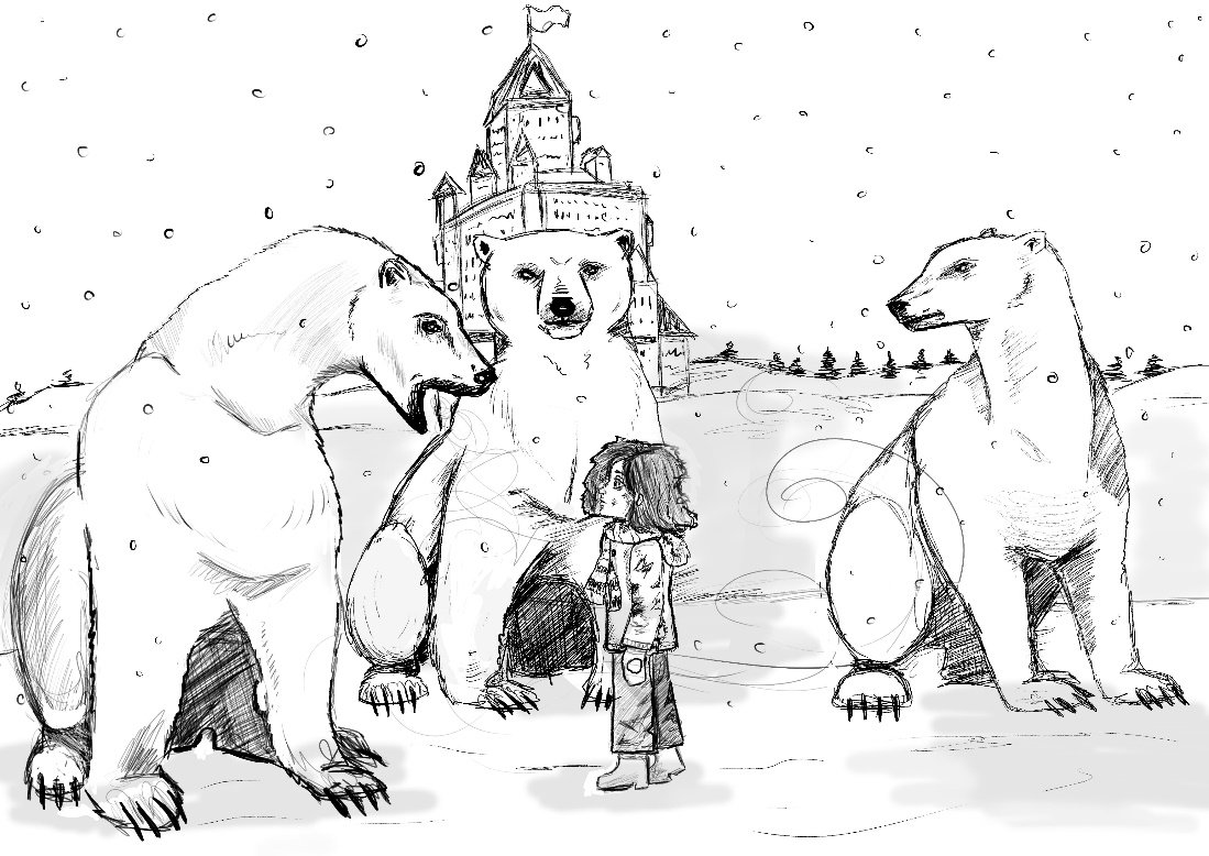 – Мы прилетели в чертоги повелителя зимы! – закричали хором снежные братцы, и тучка стала медленно опускаться. Она приснежилась прямо перед переливающимся огнями дворцом. К гостям уже бежала навстречу охрана из трёх белых медведей.