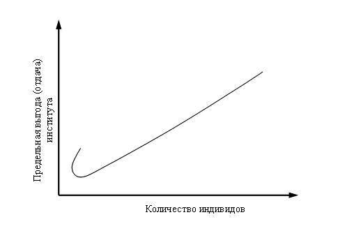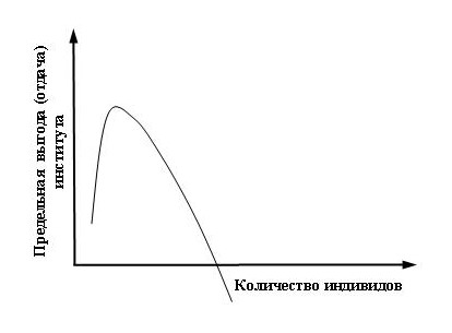При росте количества индивидов убывающая отдача в институте возможна в связи со спецификой того или иного института. Пример можно взять из командной экономики, где подобное развитие наблюдалось у института распределения льгот и экономических благ. Нужно отметить, что распределение в таких институтах происходит по принуждению и на коротком отрезке времени.