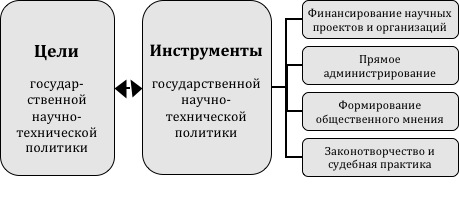 На рисунке перечислены основные инструменты, которые использует государство для достижения целей в сфере науки и техники. Обратим внимание, что связь между ними обратная, так как не только цели политики определяют, какие инструменты будут использованы, но и используемые инструменты по достижению промежуточных результатов могут дать более широкое видение текущей ситуации и породить новые цели.