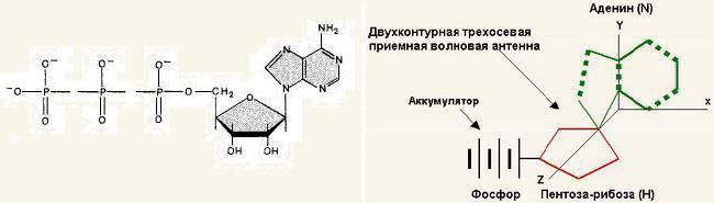 Шестигранные плиты были применены не случайно. Пирамида, как гигантский фокусирующий кристалл, использовала волновые излучения окружающей среды, и в первую очередь излучения высшего пространства, т. е. в пирамидах был реализован принцип межпространственной передачи энергии, и ни с какими другими плитами обшивки, кроме как шестигранной формы, пирамида не могла бы работать в принципе! Сущность этого применения заключается в том, что в пирамиде был реализован тот же принцип передачи энергии, что и в ДНК живой материи. Именно способность живого получать для своего функционирования энергию соседнего пространства, более высшего по уровню энергетики, есть принципиальное и главное отличие живого от не живого. Научные выкладки об этом можно найти в работах Ю. Бабикова по биологии живого. Приведем химическую формулу биологического передатчика и его аналогичную схему глазами физика (рис. 5).