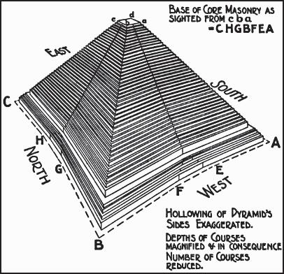 Это было обнаружено совершенно случайно в 1940 году, когда британский пилот военно-воздушных сил П. Гровс летел над пирамидой. Он случайно заметил вогнутость и зафиксировал её в ныне знаменитой фотографии. Эта странная особенность не была впервые обнаружена в 1940 году. Это было продемонстрировано в «Описании Египта» (Том V, пл. 8) (La Description de l'Egypte in the late 1700's, Volume V, pi. 8) в конце 1700-х годов. Флиндерс Петри заметил опустошение в основной кладке в центре каждой грани и написал, что он «постоянно наблюдает, что эти провалы составляли от Vi° до 1°» (рис. 8).