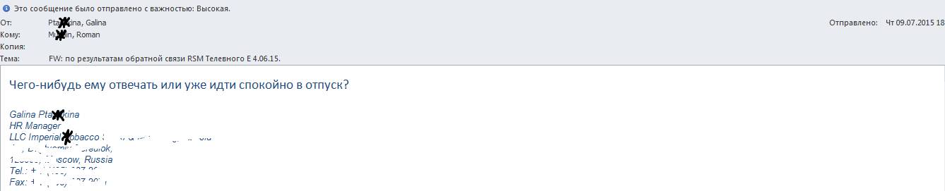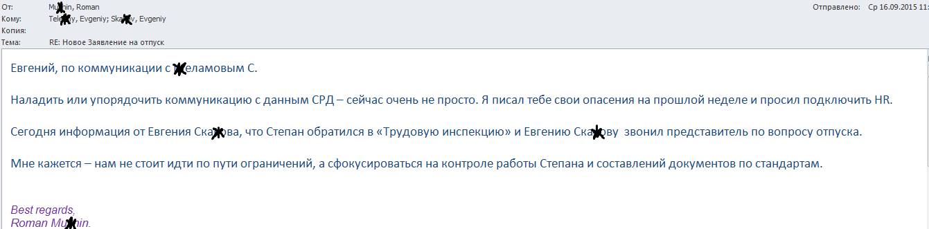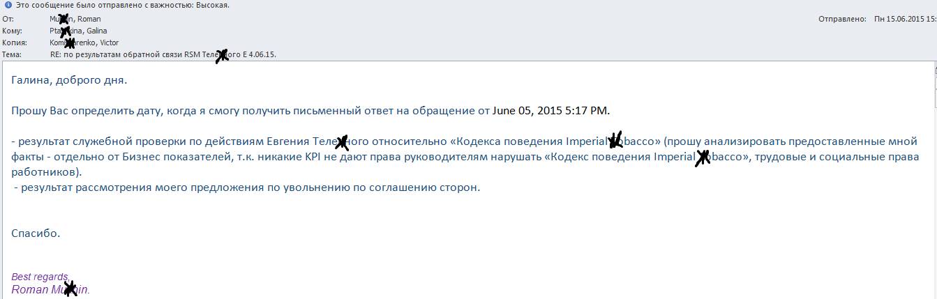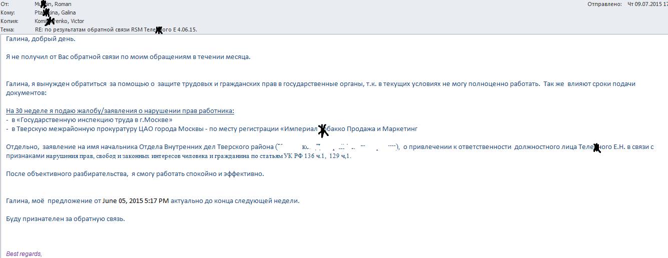 Дополнительно я написал руководителю RSM Евгению ТелеЖному письмо с обозначением проблемы и запросом поддержки службы персонала: