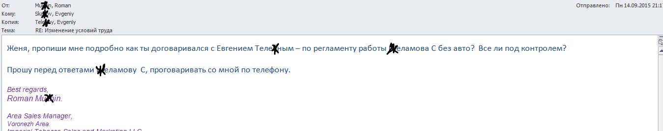 Мне кажется было бы логично и ответственно с твоей стороны ответить всем, что вопросы по данному СРД инициированы тобой и находятся под твоим личным контролем. Что задачи по увольнению СРД Желамова С (по результатам Южного проекта), лишения бонуса июля, изъятию автомобиля и изначальный отказ в предоставлении отпуска СРД Желамову – ты лично ставил по телефону ASS СкаЖову Евгению, минуя меня и моё мнение. Я узнавал информацию от ASS СкаЖова Евгения. Супервайзер при этом ответственно выполнял твои задачи. Я так же проводил плановые мероприятия по аудиту совместно с ASS территории Елец и индивидуальные встречи с Желамовым С, прописывал тебе своё мнение.
